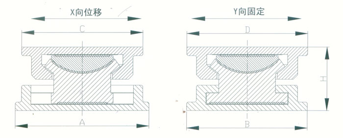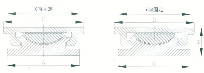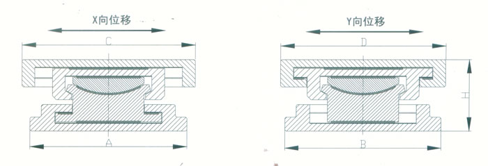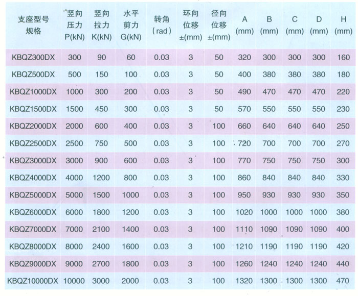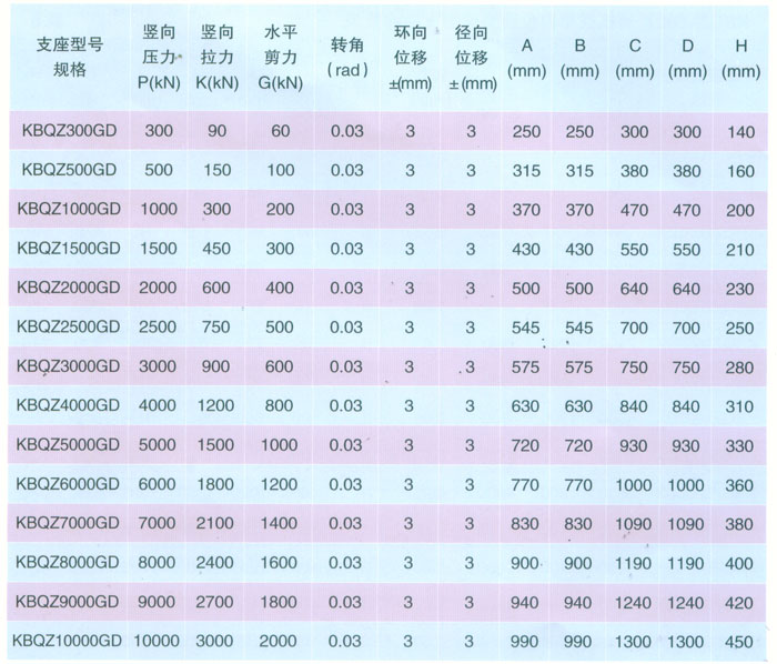 4 KBQZ系列抗拔球型支座 本系列支座主要分為抗拔球型支座和減震抗拔球型支座,下面對(duì)其進(jìn)行分類介紹。4.1抗拔球型支座 此類支座分為固定型、單向位移型和雙向位移型,支座結(jié)構(gòu)如圖3。其主要由支座頂板、不銹鋼板、平面聚四氟乙烯滑板、球冠襯板、球面聚四氟乙烯滑板、中支架、聚四氟乙烯滑板、不銹鋼板和滑移箱組成。支座中的相對(duì)滑移部件之間,采用目前世界上摩擦系數(shù)最低的聚四氟乙烯滑板和不銹鋼板相隔,充分減小了摩擦阻力,使各部分之間的運(yùn)動(dòng)流暢,避免爬行現(xiàn)象的產(chǎn)生。本類支座通過球面聚四氟乙烯滑板上部構(gòu)件沿著球面相對(duì)于下部構(gòu)件的轉(zhuǎn)動(dòng)實(shí)現(xiàn)轉(zhuǎn)角(常用值為0.02rad),在工作過程中支座沿著滑移箱滑道滑動(dòng)實(shí)現(xiàn)水平位移。 豎向壓力的傳遞是通過支座頂板,不銹鋼板,平面聚四氟乙烯滑板,球冠襯板,球面聚四氟乙烯滑板,中支架,聚四氟乙烯滑板,不銹鋼板依次疊加傳至滑移箱底板。 豎向拔力的傳遞是通過支座頂板和中支架的抗拔接觸面將作用于支座頂板上的上.拔力傳至中支架,再由中支架與滑移箱之間的抗拔四氟滑板和不銹鋼板將力傳至滑移箱頂板。 水平力的傳遞是通過支座頂板側(cè)壁與中支架側(cè)壁之間.的接觸面將水平力傳至中支架,再由中支架與滑移箱的接觸面?zhèn)髦粱葡鋫?cè)壁根部。 固定型抗拔球型支座不設(shè)滑移箱。4.1.1普通抗拔雙向位移型球型支座KBQZ-SX普通抗拔雙向位移型球型支座參數(shù)表 表74.1.2普通抗拔單向位移型球型支座KBQZ-DX普通抗拔單向位移型球型支座參數(shù)表 表84.1.3普通抗拔固定型球型支座KBQZ-GD普通抗拔固定型球型支座選用參數(shù)表 表9